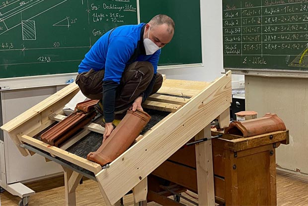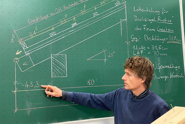 Theorie und Praxis sind Teil des Berufsgrundschuljahres für Zimmerer/Zimmerinnen: Hier erklärt Fachlehrer Andreas Schillinger eine Aufgabe zur Dachdeckung.