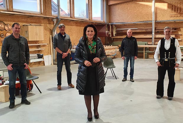 Vor kurzem besuchte Forstministerin Michaela Kaniber den Innungsbetrieb Holzbau Koch in Ainring (Zimmerer-Innung Traunstein/Berchtesgadener Land). Dort diskutierte sie mit Obermeister Martin Kollmeier, zwei weiteren Innungsmitgliedern und Rosenheims stellvertretendem Obermeister Franz Wörndl über die regionale Holzversorgung.